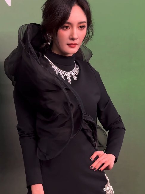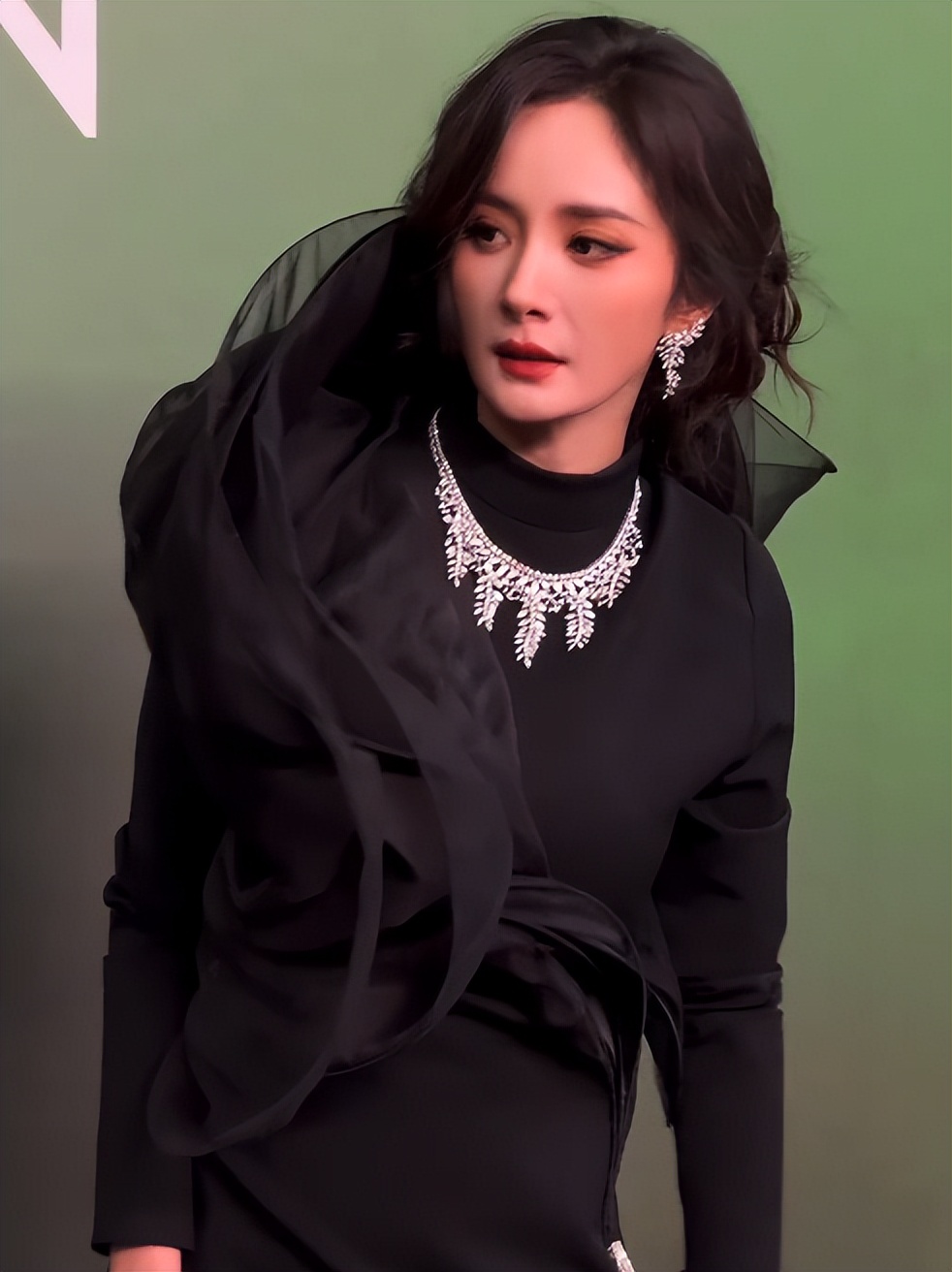 不过,上半身的设计太繁琐了,应该是想要营造出牡丹花瓣的感觉,结果布料不够有型,像是皱皱巴巴的黑色蚊帐,还挡住了杨幂的脖子,看起来头重脚轻。