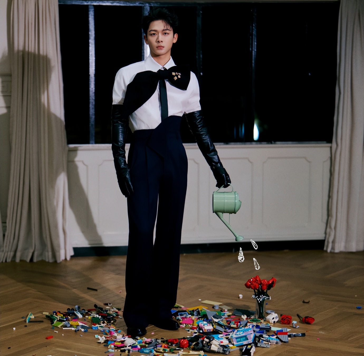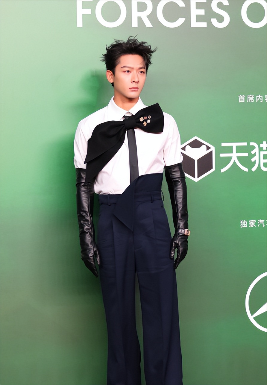 而他在花少团里的好兄弟张晚意,却挑战了胸前带有大蝴蝶结,搭配皮手套的前卫造型。