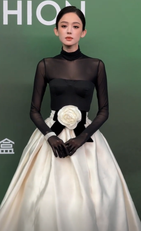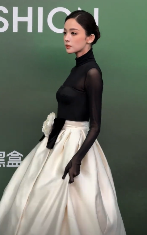 上半身的网纱布料还格外显身材,让她看上去肩颈线条和手臂曲线都相当优越,仿佛是一只高傲的黑天鹅,冷艳又高级,也有人称赞其“复刻奥黛丽·赫本风韵”,美得太出众了。