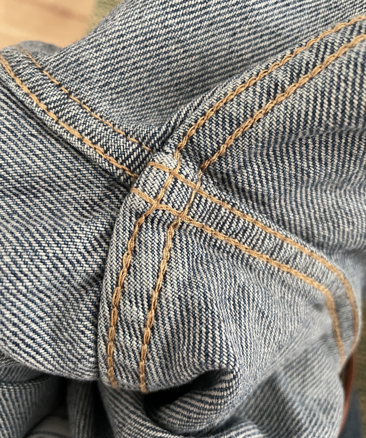 那条“一”不竖向顺着裆部,不服帖,就会有卡裆的感觉,十字浪的剪裁更贴合人体活动弧度,所以更舒适,还更结实耐穿,一条裤子穿十年不是梦。