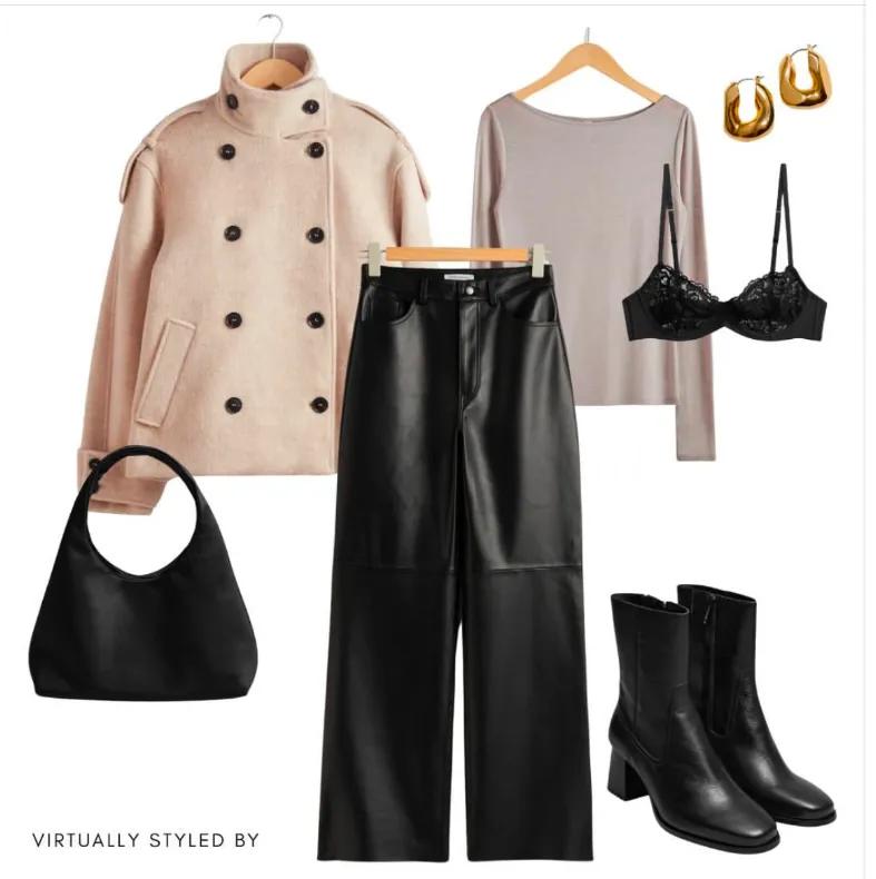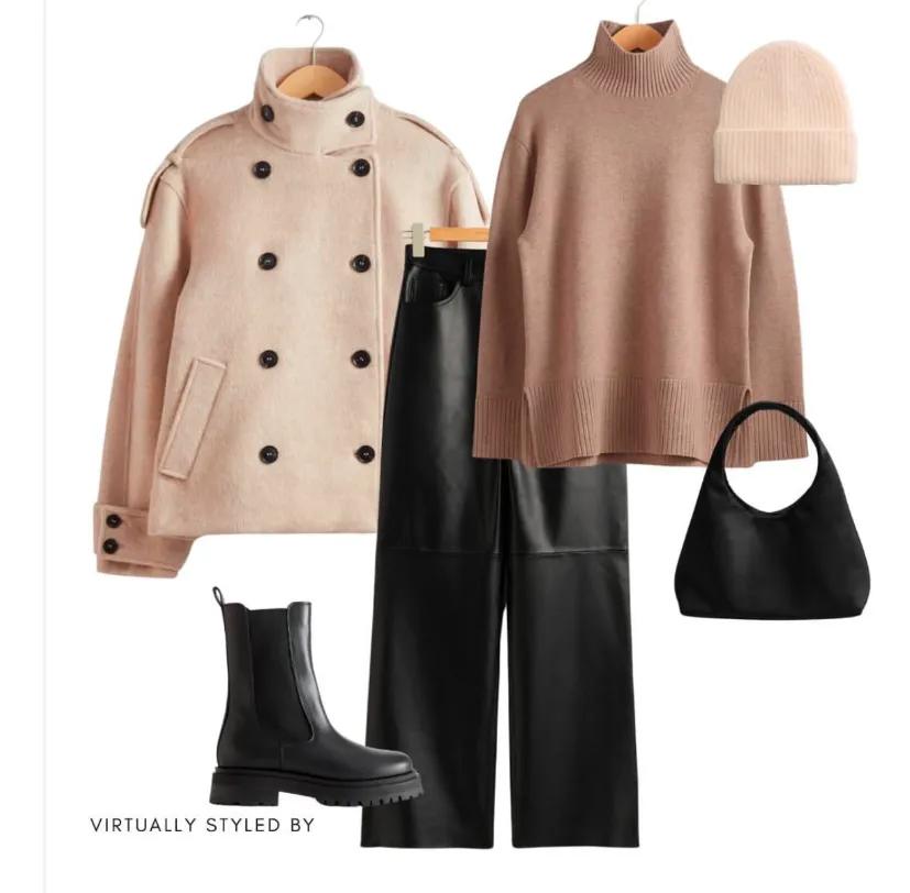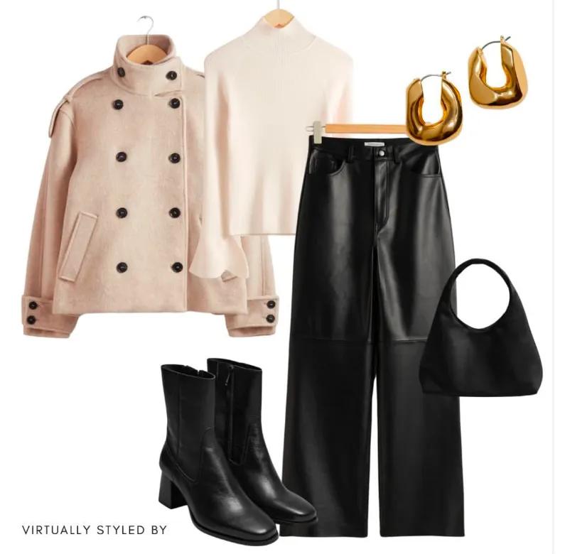 皮裤特别适合短款夹克,尤其适合娇小女生穿出霸气感。阔腿裤的版型冬天还能放心穿保暖裤,实用还帅气。