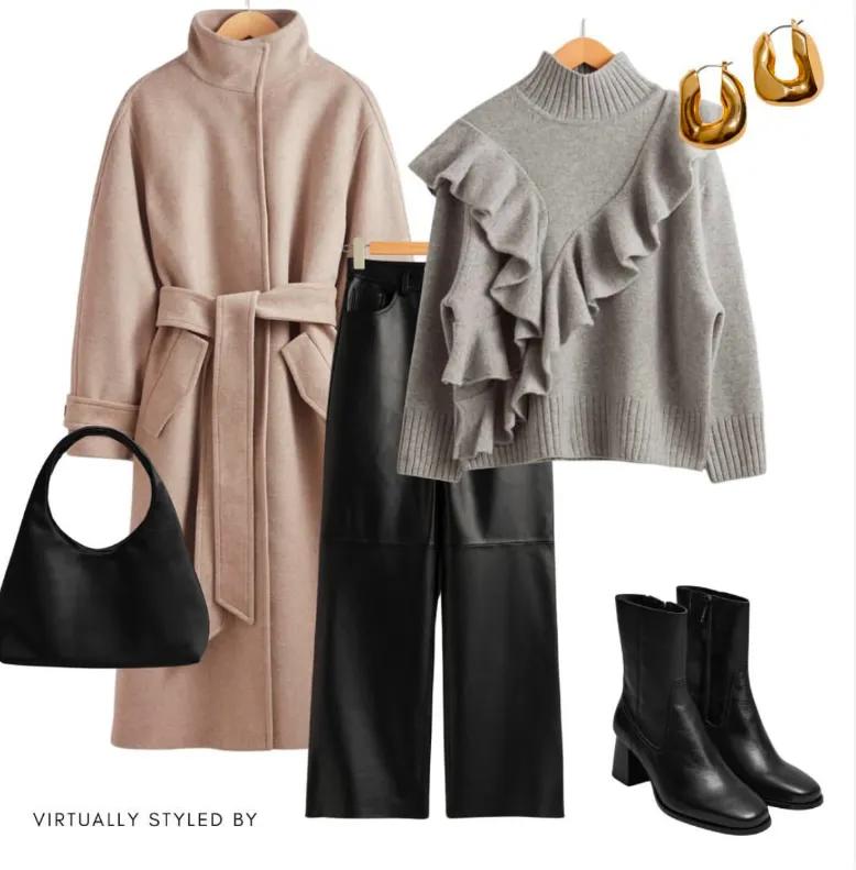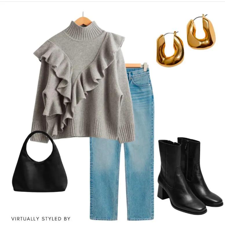比如胸前点缀荷叶边的毛衣,让灰色也能灵动起来。或是用同色系的高领毛衣呼应外套,从酷感皮裤到休闲风的牛仔裤,再搭配有型短靴,穿得干净也大方。