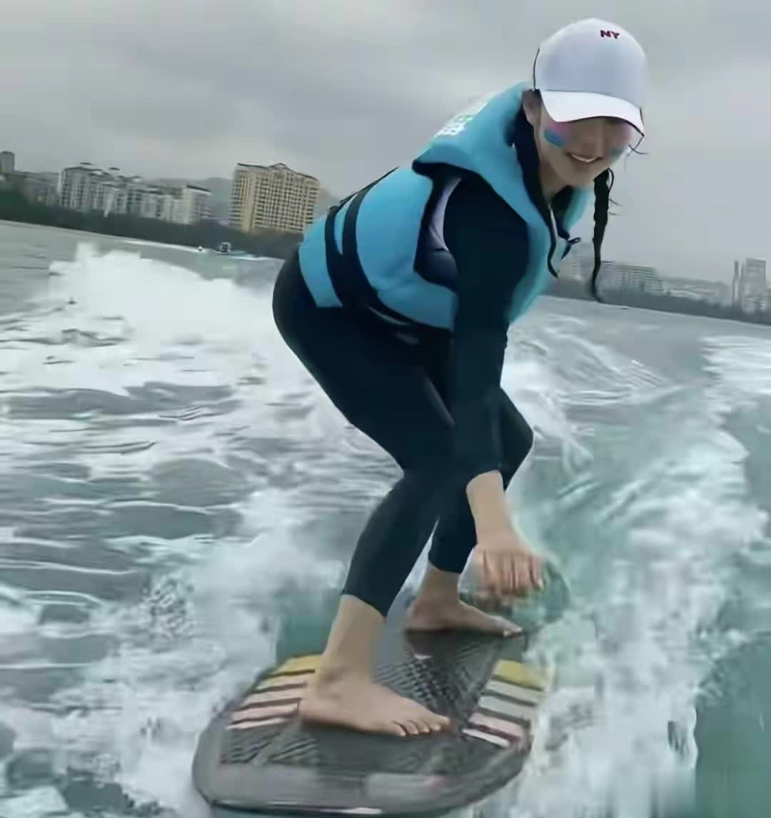 谁能想到,平时低调顾家的她,玩起冲浪这么有天赋,教练示范两遍就敢上板,站稳、滑行一气呵成,平衡感好到让人惊讶,估计是家里运动员氛围耳濡目染的缘故。