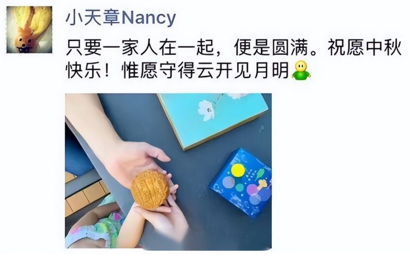 当年刘先生出事之后,章女士选择相信他,还晒出了全家拿着月饼的照片,配文道: