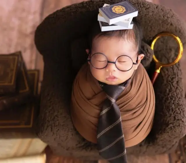 还有一张小家伙做出鬼马的表情,他伸出舌头,侧面对着镜头,也是非常调皮。还有一套衣服将小家伙打扮成知识分子的模样,戴着眼镜,不过当时的小家伙闭起了双眼,不知道是真的累了,还是摄影师指定他做出这样的动作。