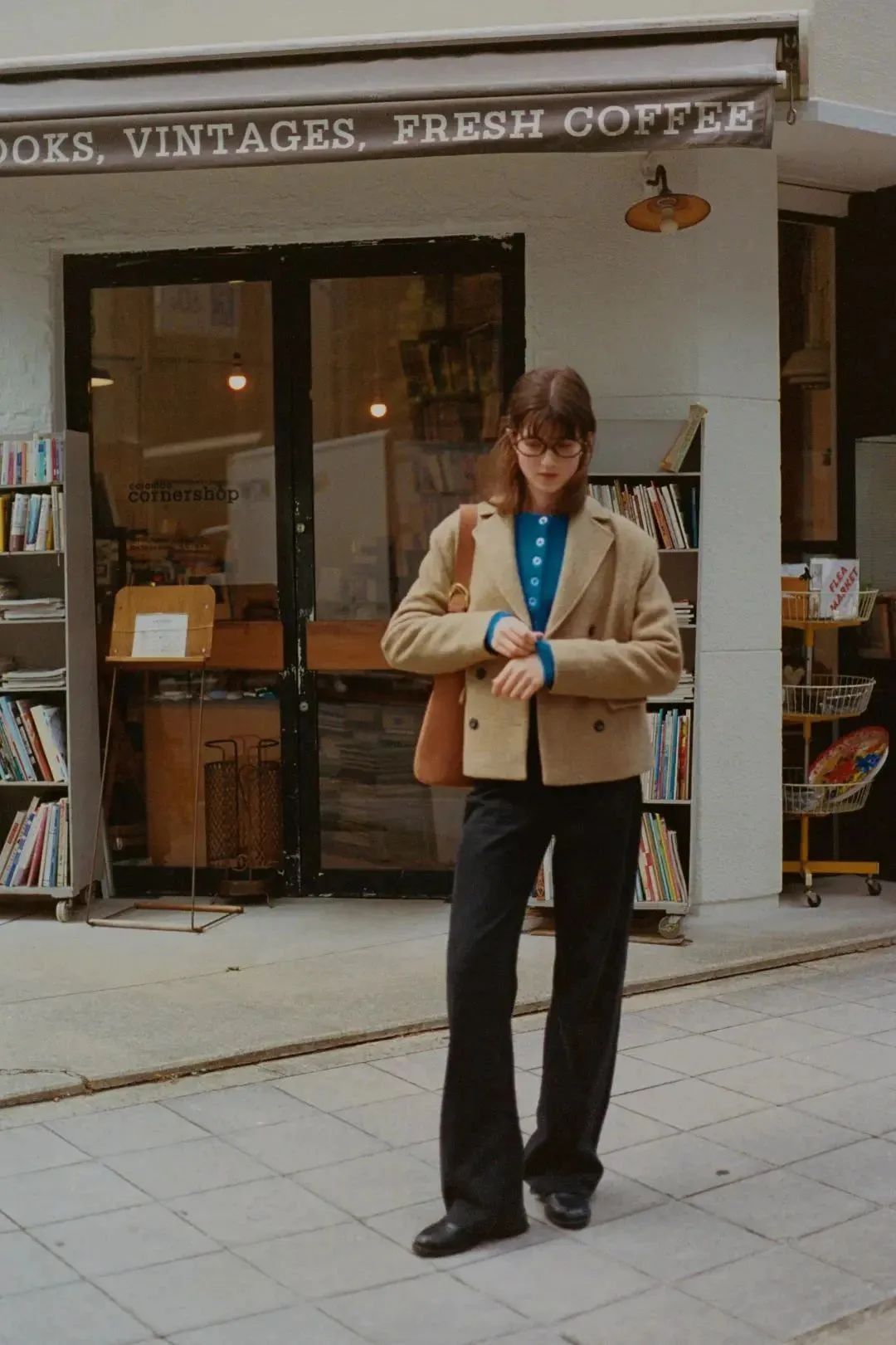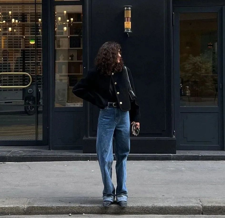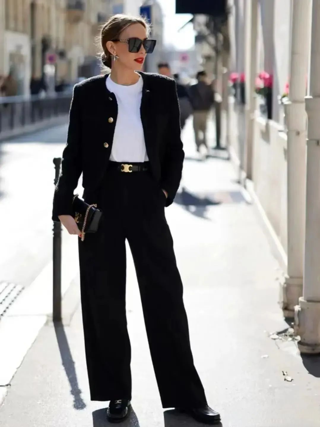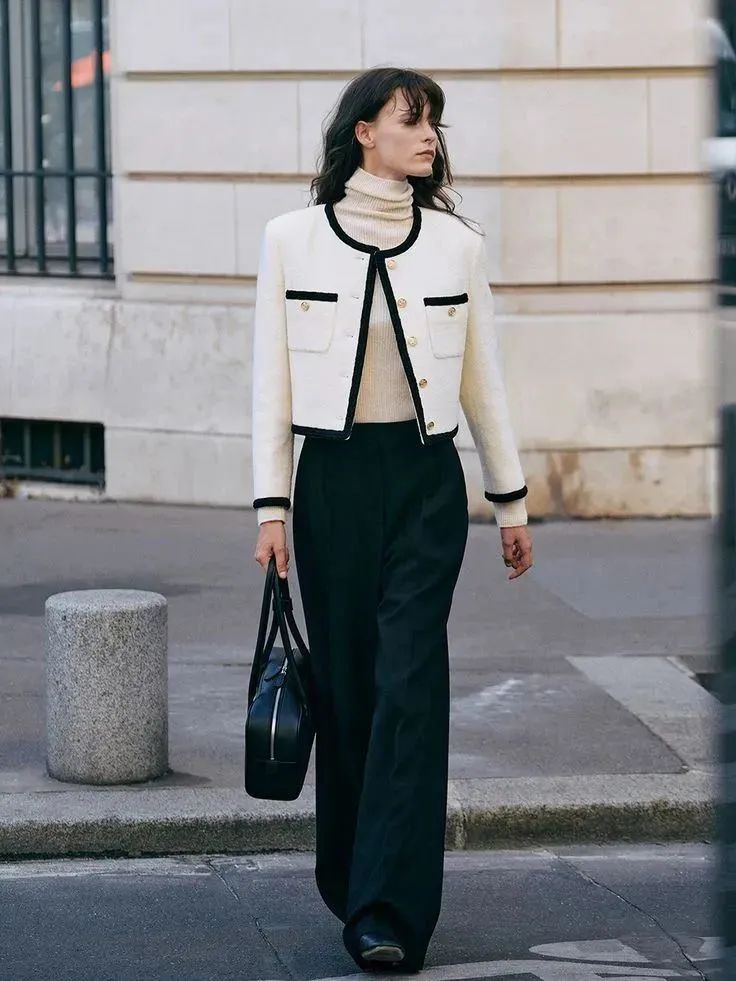 深色小香风外套搭配黑色高腰阔腿西裤,