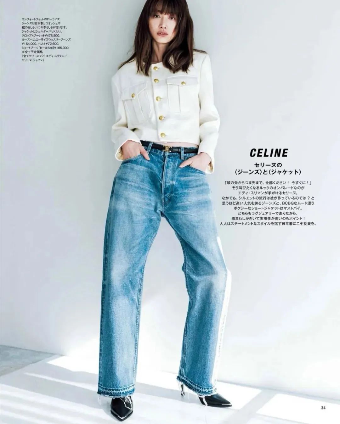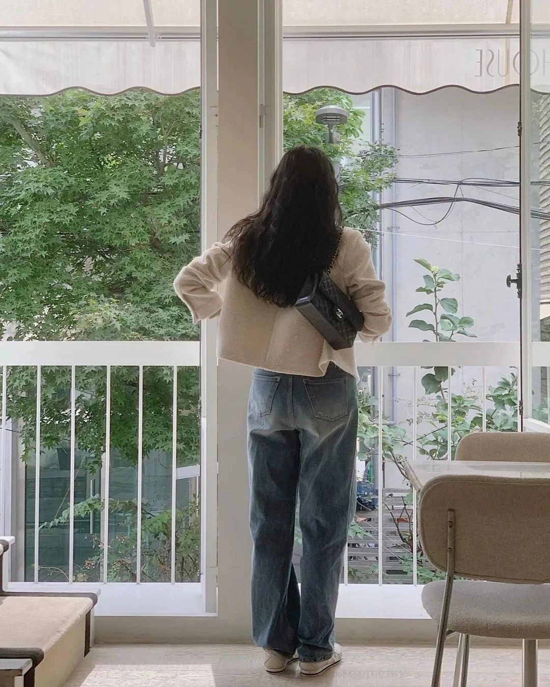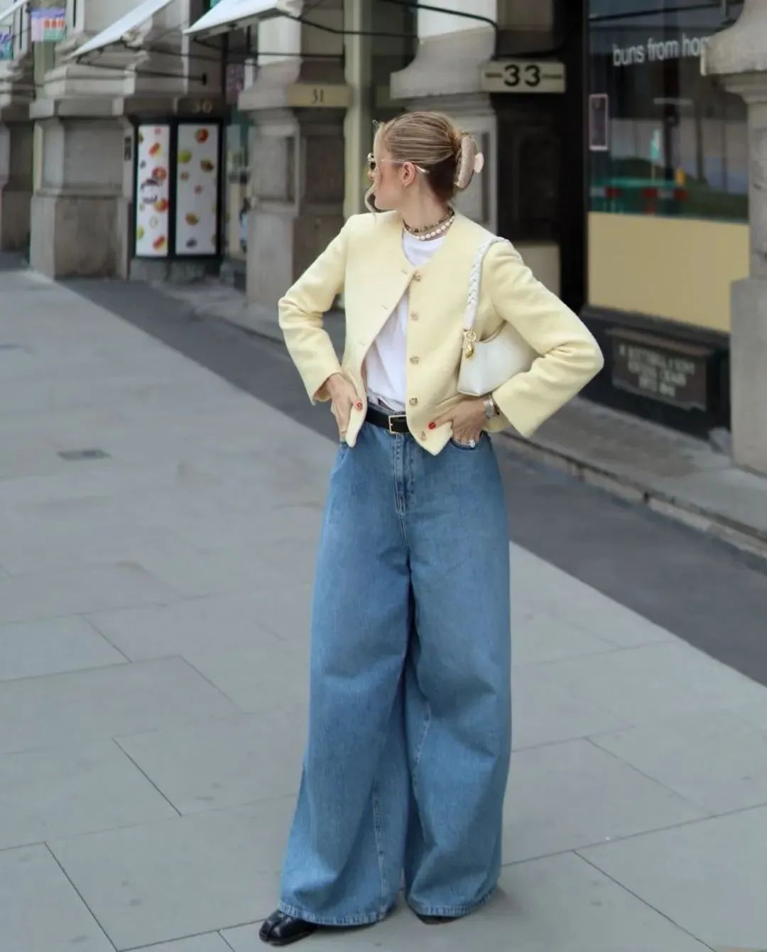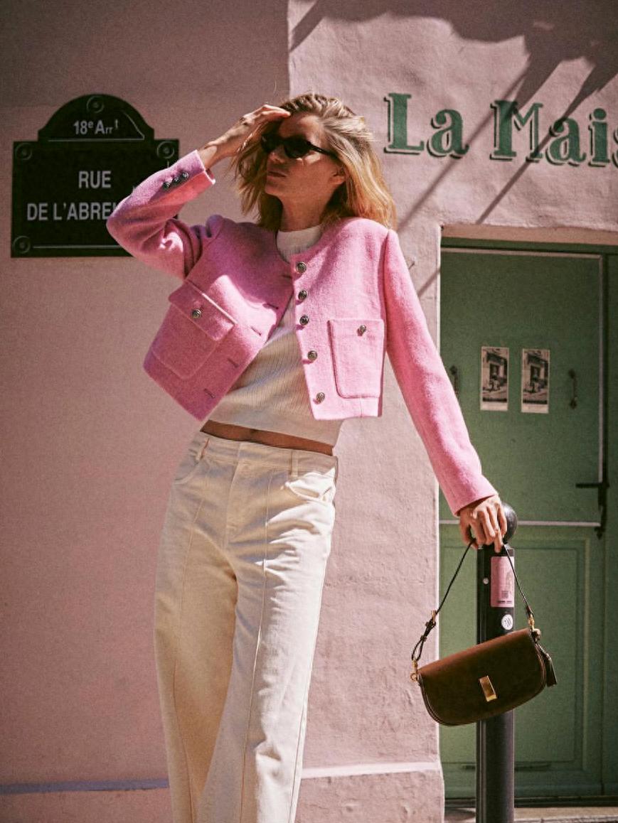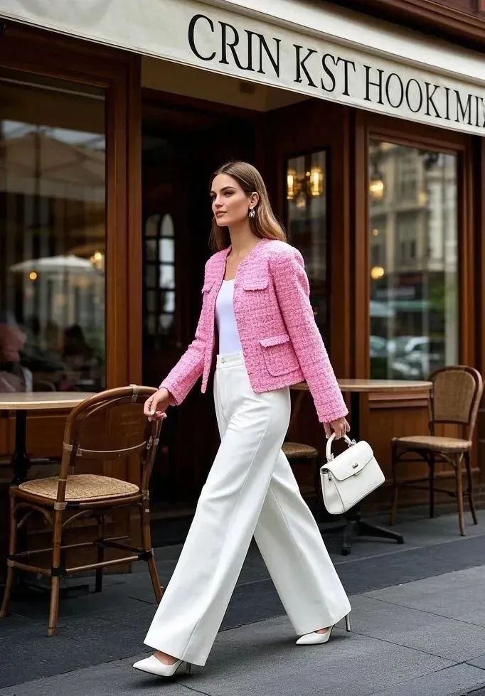 粉色的小香风外套搭配白色的高腰阔腿牛仔裤,