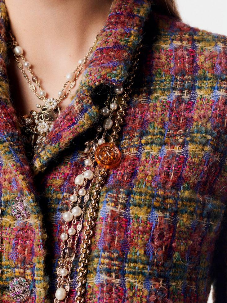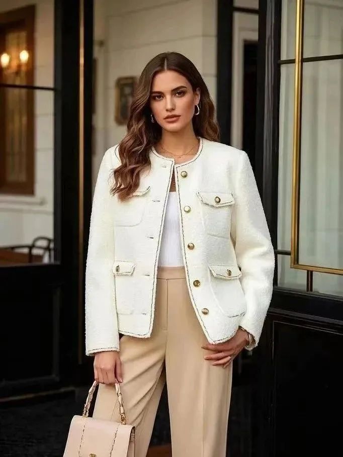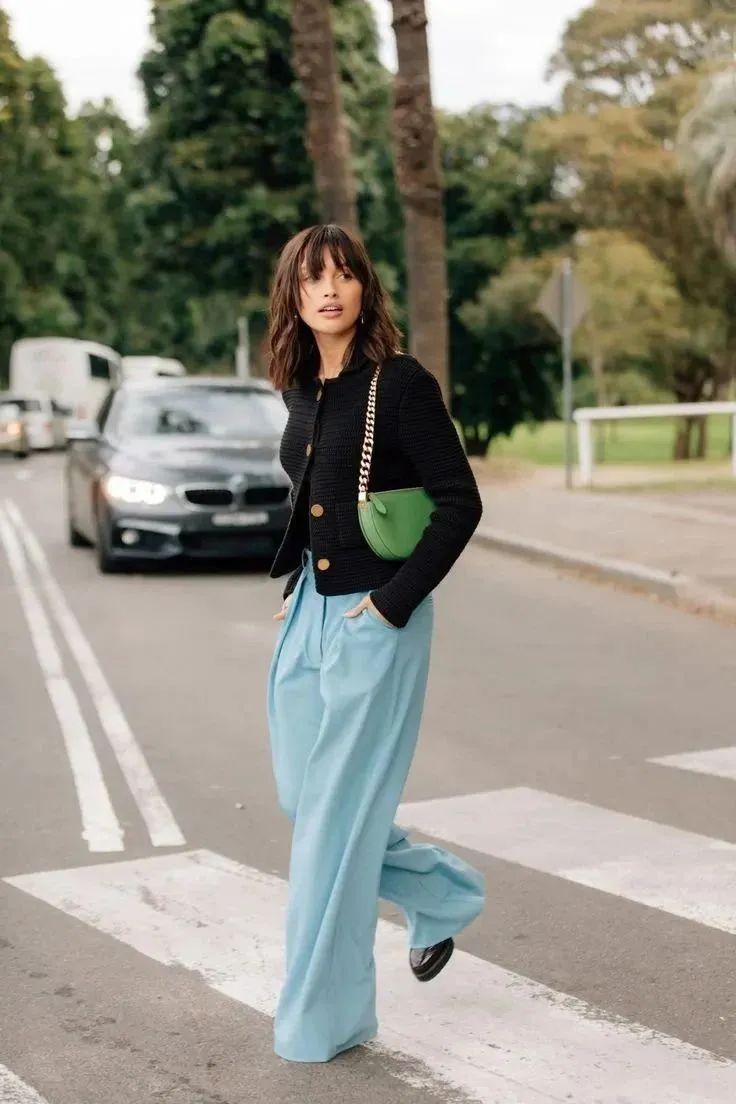 可以选择彩色小香风外套搭配浅色阔腿裤。