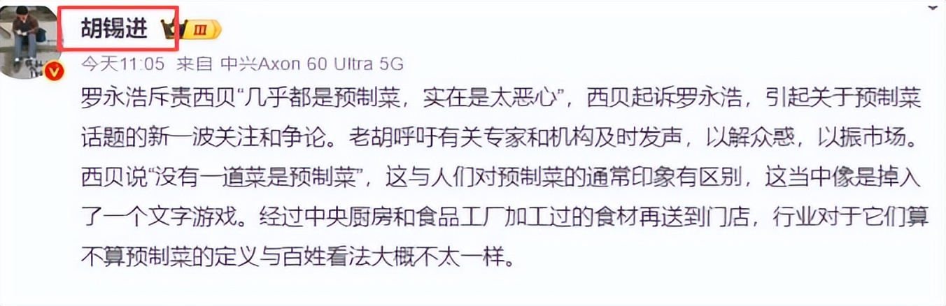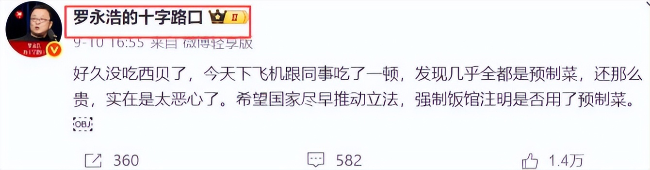 前几日,他突然在网上发文表示自己在西贝吃饭时,却发现桌上几乎都是预制菜。