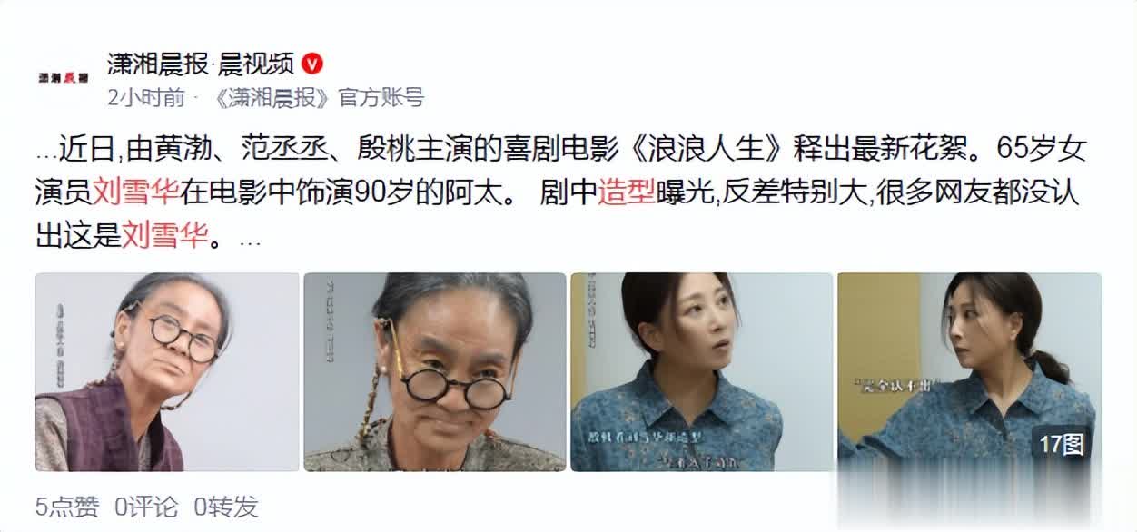 采访中殷桃坦言:“我还以为是特效化妆,太逼真了!” 这次造型其实是为了新角色特意保持的状态,但刘雪华的真实状态也十分吓人。 她在电影《浪浪人生》中饰演90岁的阿太,与她平时的造型反差极大。