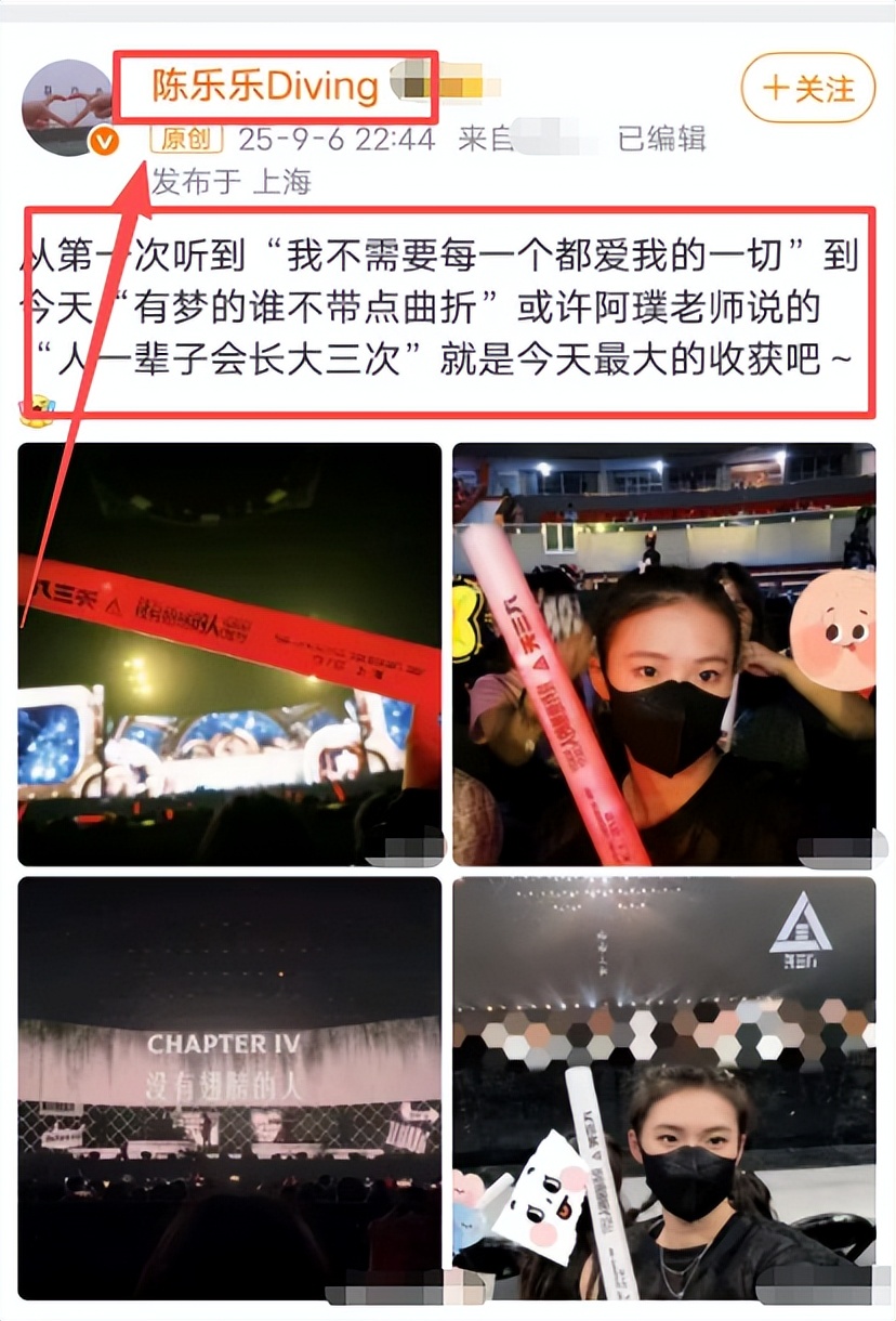 9 月 6日晚上,陈芋汐在个人社交账号上更新了一组图片,记录的是她观看中国台湾地区九三夭乐队演出的经历。