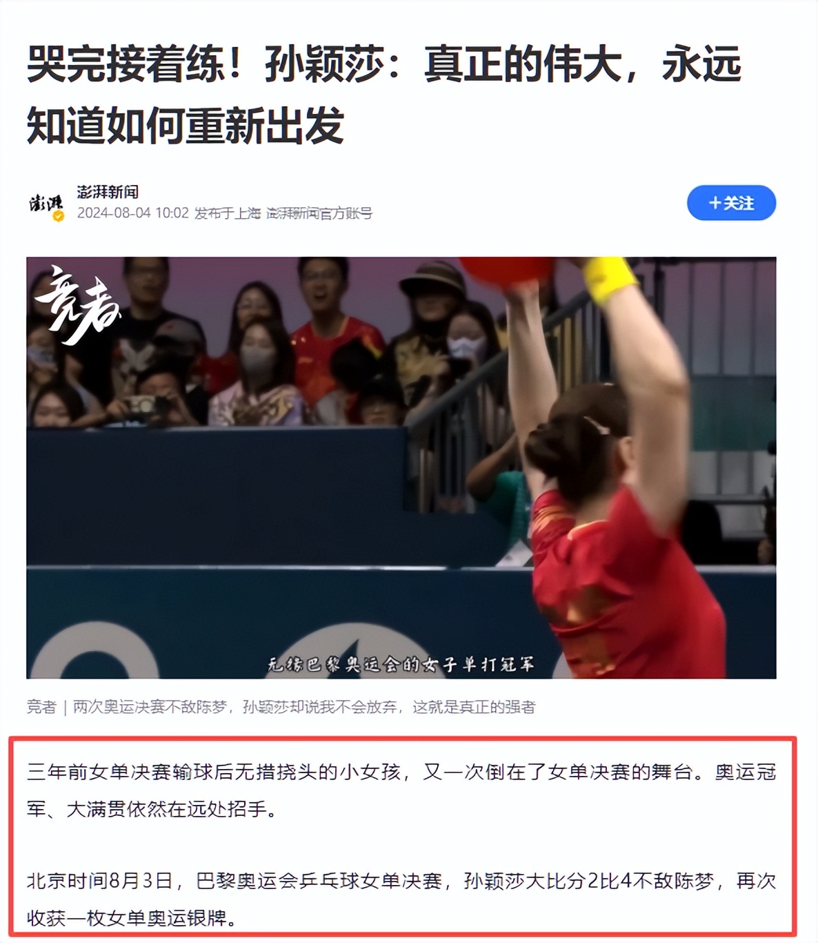 而孙颖莎正是因为对自己的标准要求太高,才让“巴黎失利”成为了自己心里的一根刺。