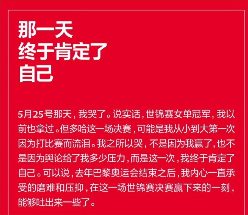 她自己解释说那次哭不是因为赢了或者舆论压力太大,而是终于肯定了自己。