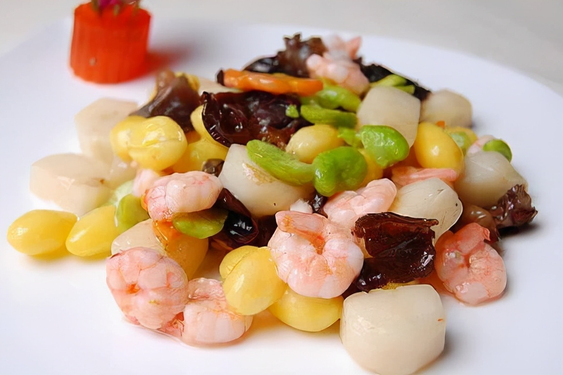 3、锅留底油烧热,下马蹄、虾仁、红黄辣椒块,加盐、白糖调味,炒熟,勾薄芡,装盘即可。