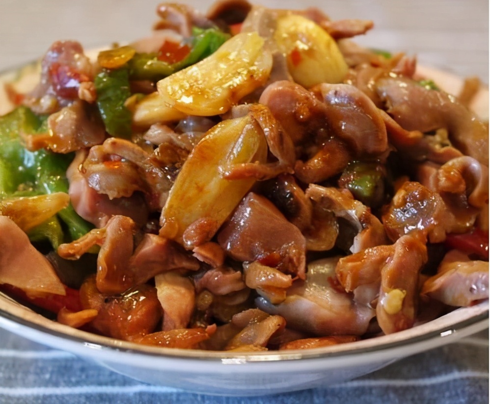 4、放腌好的鸡胗片大火翻炒至断生;加入青椒块翻炒,加少许老抽,炒至青椒断生, 放少许盐,淋少许香油即可。