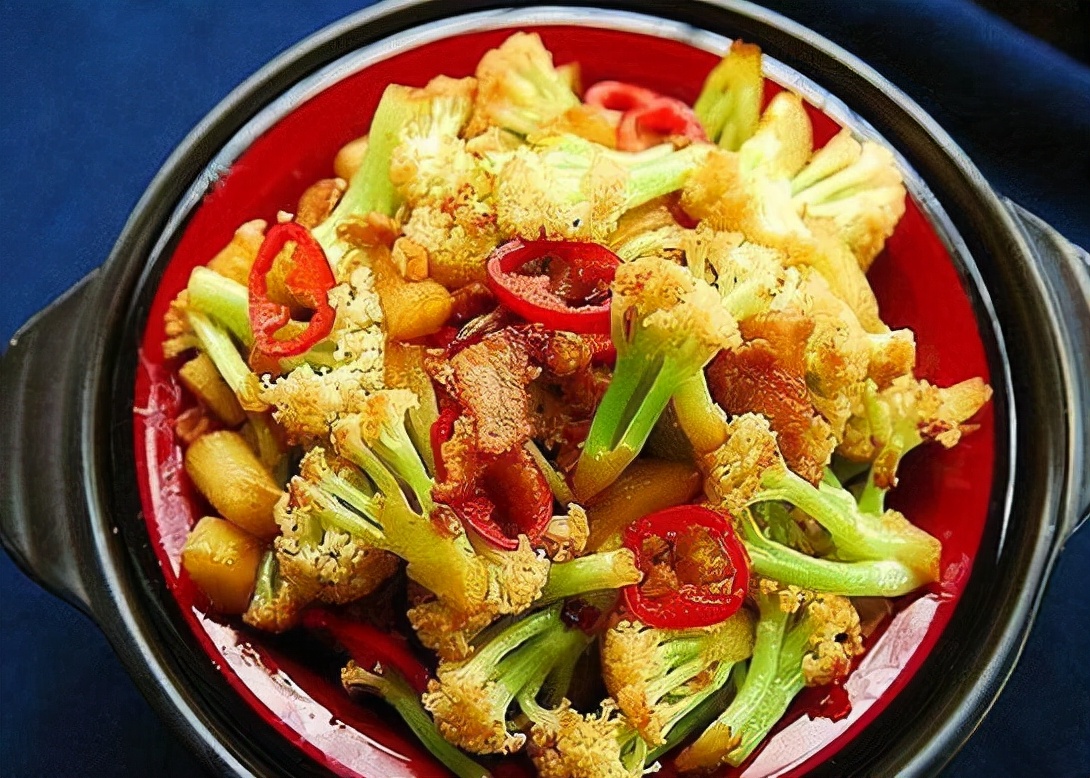 3.开大火,油热的时候倒入菜花,铺匀略煎30秒再翻炒几下。