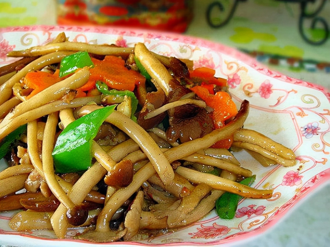 5.加入茶树菇继续翻炒后,加入盐,酱油(建议用淡酱油)翻炒均匀。