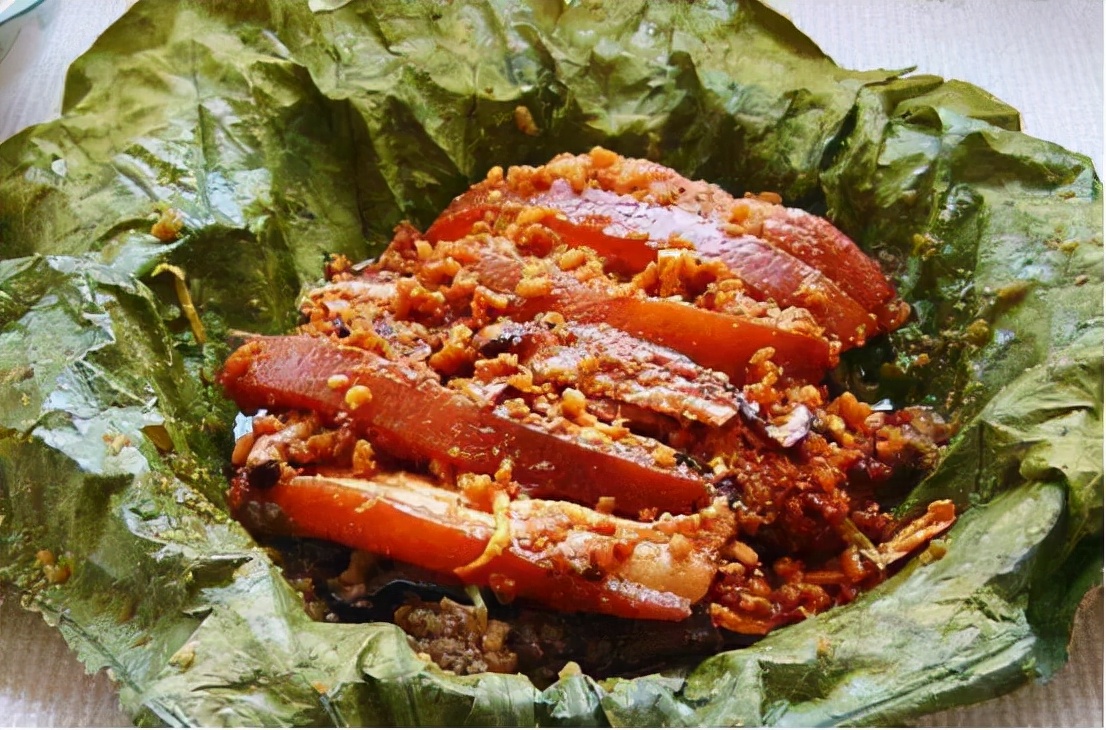 4.荷叶用水浸泡一会,泡软后晾干,把肉铺在荷叶上面。
