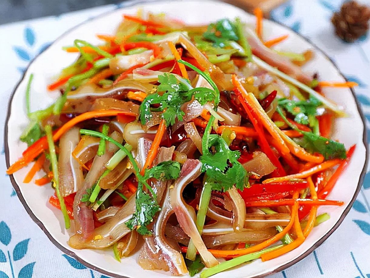 4、倒入切好的猪耳朵,放入香菜段、葱丝、红椒丝、青椒丝、胡萝卜丝,抓拌均匀,开动吧,特别香的凉拌猪耳朵,下酒又下饭。