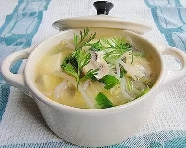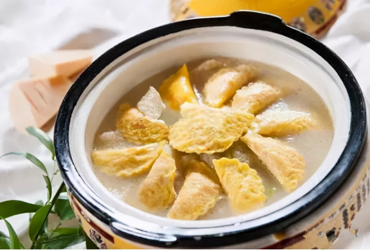4、鸡汤煮开,放入皮肚、木耳、菜薹、蛋饺,加盐、鸡精、胡椒粉、菜籽油调味,装盘即可。