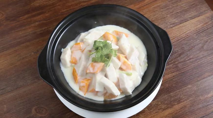 -材 料-南瓜200g、大芋头200g、椰浆150g,植物油、盐、蔬果粉、生姜、香菜适量