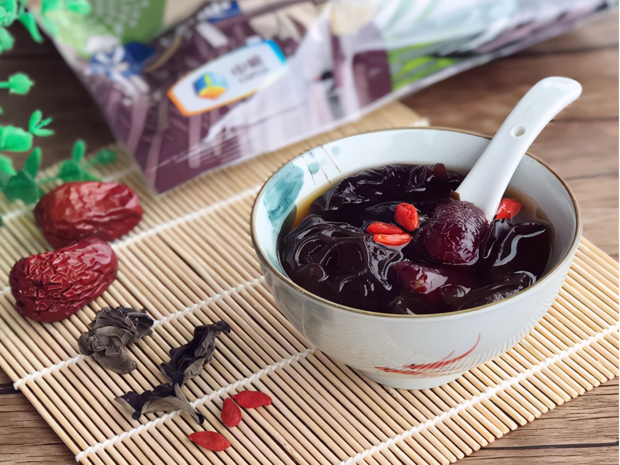 食材:干黑木耳30g、红枣10颗、枸杞子7g、红糖适量
