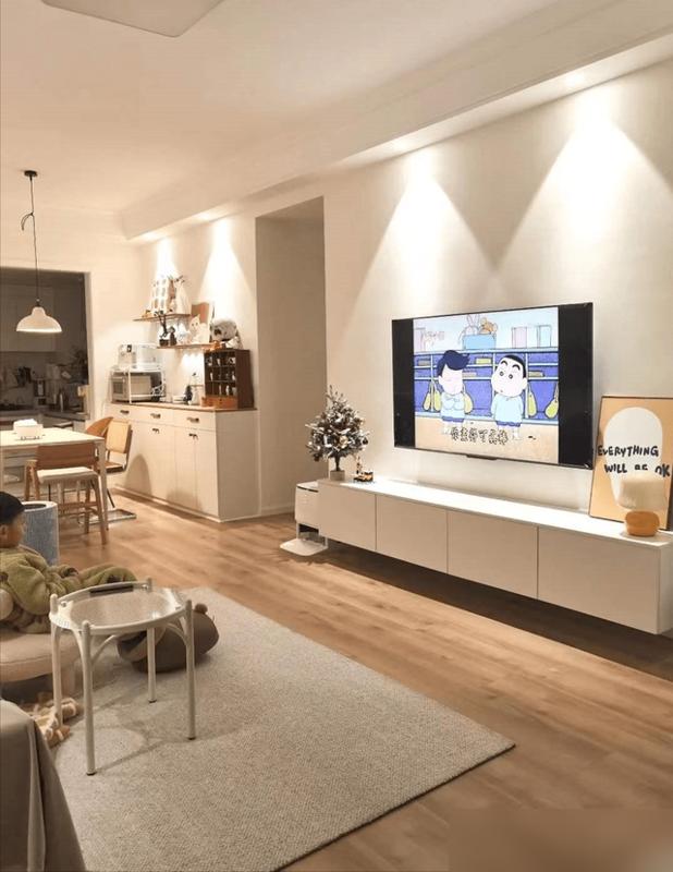 玩具房杂物收进电视墙柜子,客厅常年干干净净。