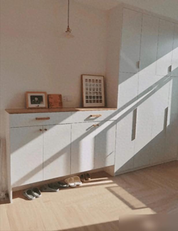 进门玄关柜底下空一截,常穿的鞋子往里一踢,门口立马清清爽爽。