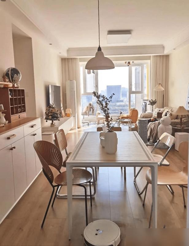 客餐厅打通后敞亮得像开了滤镜,哑光木地板配米白墙,阳光一照,像把温暖腌进了砖缝里。