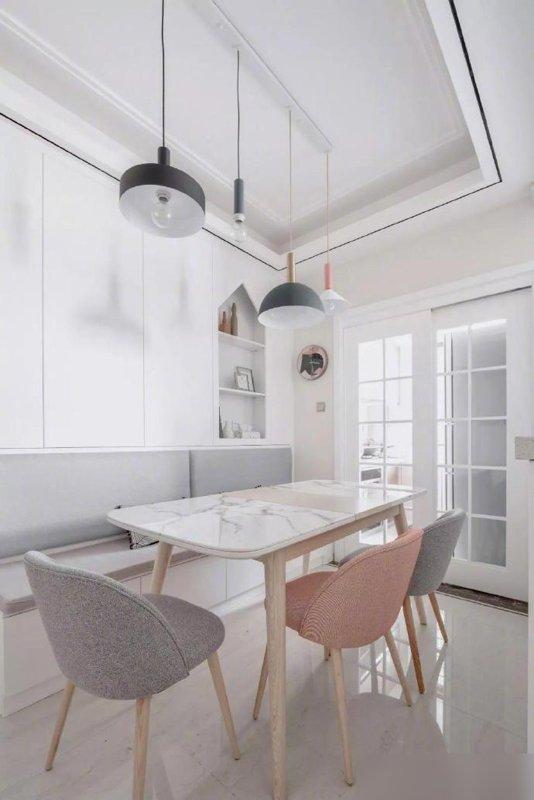 反而砌了半高的矮墙当“靠山”,里面藏着柜子。这操作绝了:既把客餐厅隔开,保持通透感,又偷偷多了储物空间,放个零食、抱枕啥的,比直接打一排立柜聪明十倍。再看餐厅的卡座,底部是抽屉,靠背上面是隐形柜——你说这设计师是不是把每一寸墙都“挖”过?