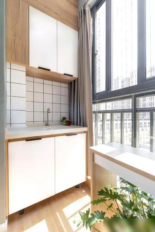 还有次卧的高箱床,带三个大抽屉——冬天的棉被、换季的衣服不用塞床底积灰,拉开就能拿;次卧阳台更绝,吊柜+地柜+洗手台,旁边摆个小桌子,既能洗衣又能办公,太阳晒进来的时候,在这写方案比在客厅舒服多了。