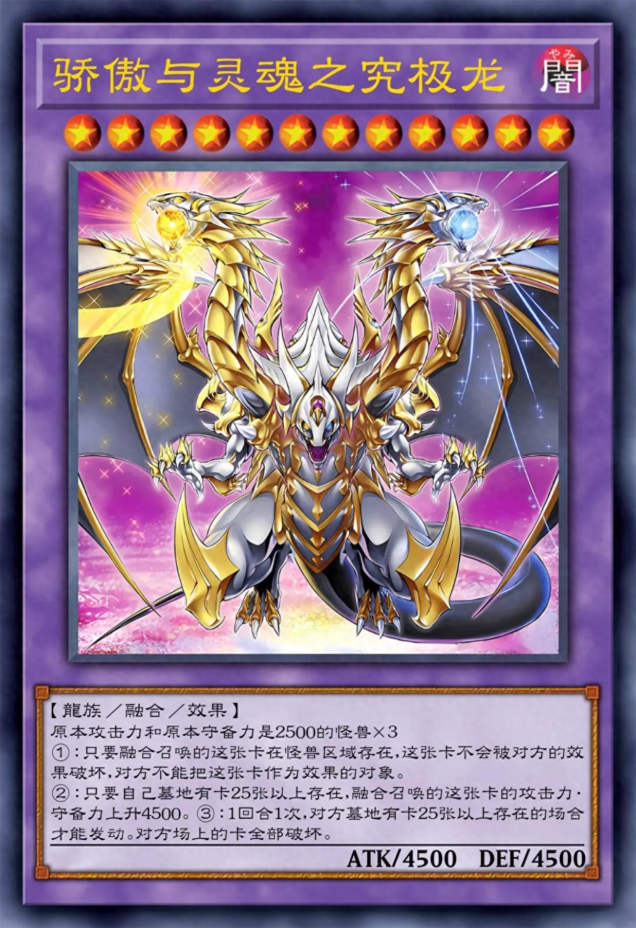 例如这只骄傲与灵魂之究极龙,其效果就能帮助其增幅4500点数值的攻击力,让其攻击力达到9000点,再来一张攻击力增加1000点以上的装备卡,那攻击力过万很轻松。