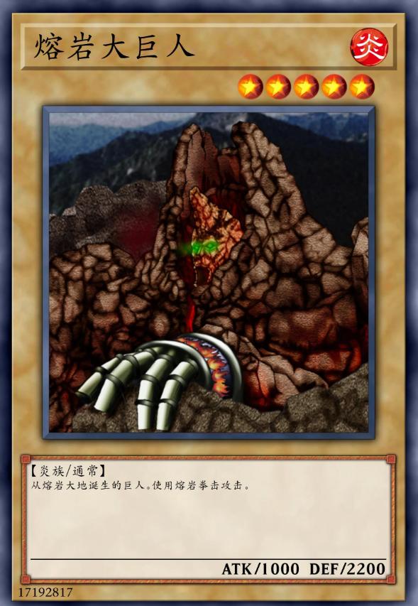 其造型方面,像是包裹着岩浆的人形火山,且有着机械光泽的巨大手掌存在。光看卡面的话,大概会觉得这只怪兽应该比较强大,但是也是一个只有空壳子的纸老虎罢了。真的献祭召唤它的话,遇到一个攻击力2300点数值的怪兽,当时就被干掉了。