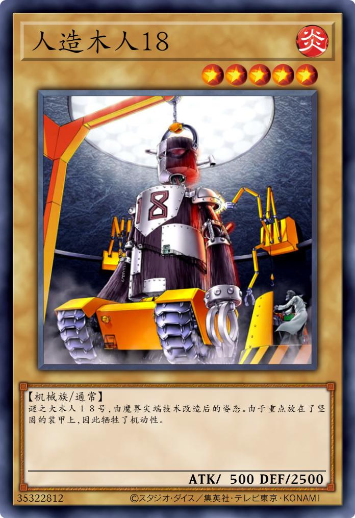 木人18系列的怪兽之一,人造木人18,这只怪兽也是五星怪兽,需要祭品才能召唤的存在,其攻击力数值相对上面的怪兽们又高了不少,但是还是没有过1千的关卡,其防御力2500点的数值,则是其最后倔强。