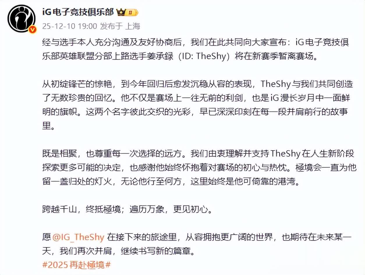 首先是IG官博发布官宣,表示和theshy本人沟通后,他选择暂别赛场!之后回顾了theshy职业生涯的表现,表示尊重theshy的选择,IG会永远为他亮起灯火,做他依靠的港湾。最后就是祝福theshy未来可以拥抱更广阔的世界,也期待未来可以再次并肩。