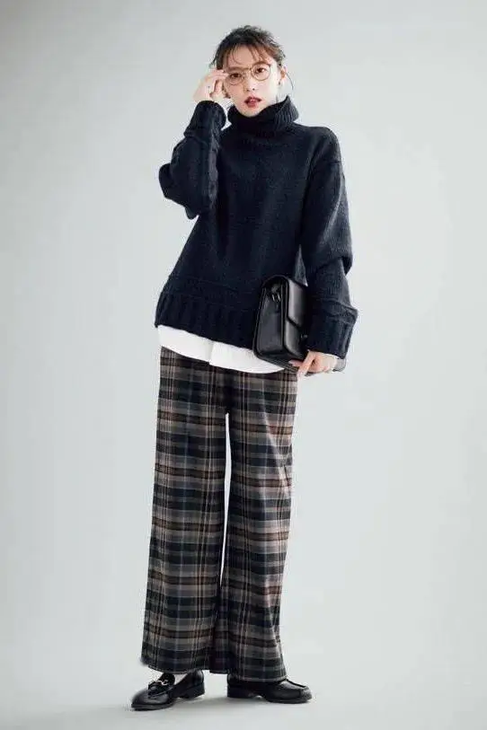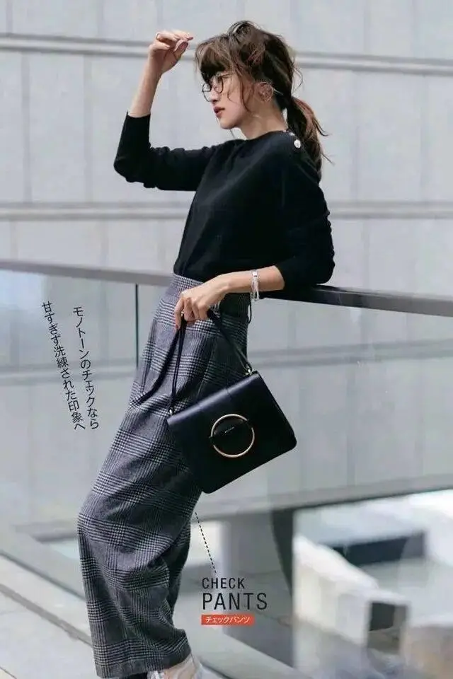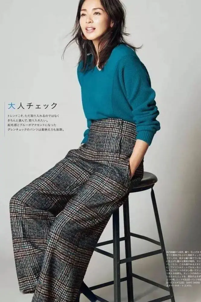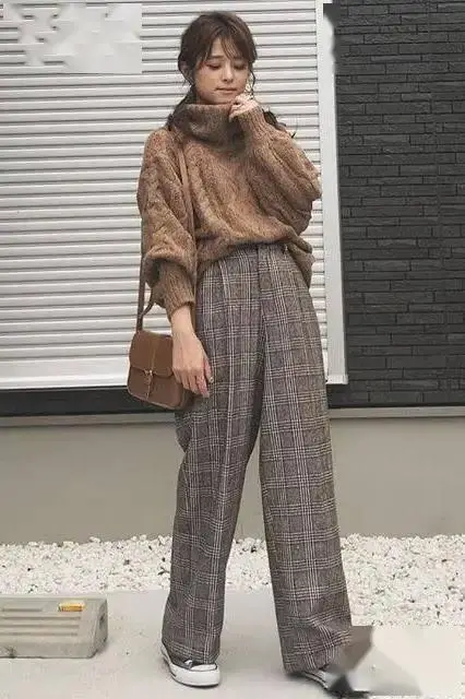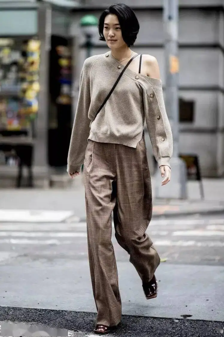自带复古标签的格纹阔腿裤,无论与哪种毛衣搭配,都能让你的冬季look充满vintage感,颇具复古文艺范。格纹配色不超过三种更实穿,素雅的灰色、咖色格纹款经典复古且好搭;若能实现格纹与毛衣颜色呼应,整体造型会更有品味和整体感,今冬这样穿特别洋气时髦。
