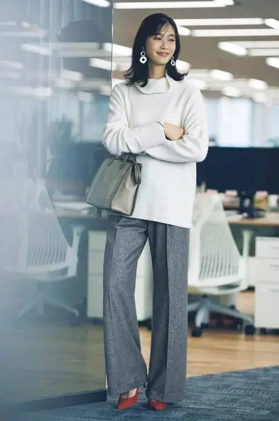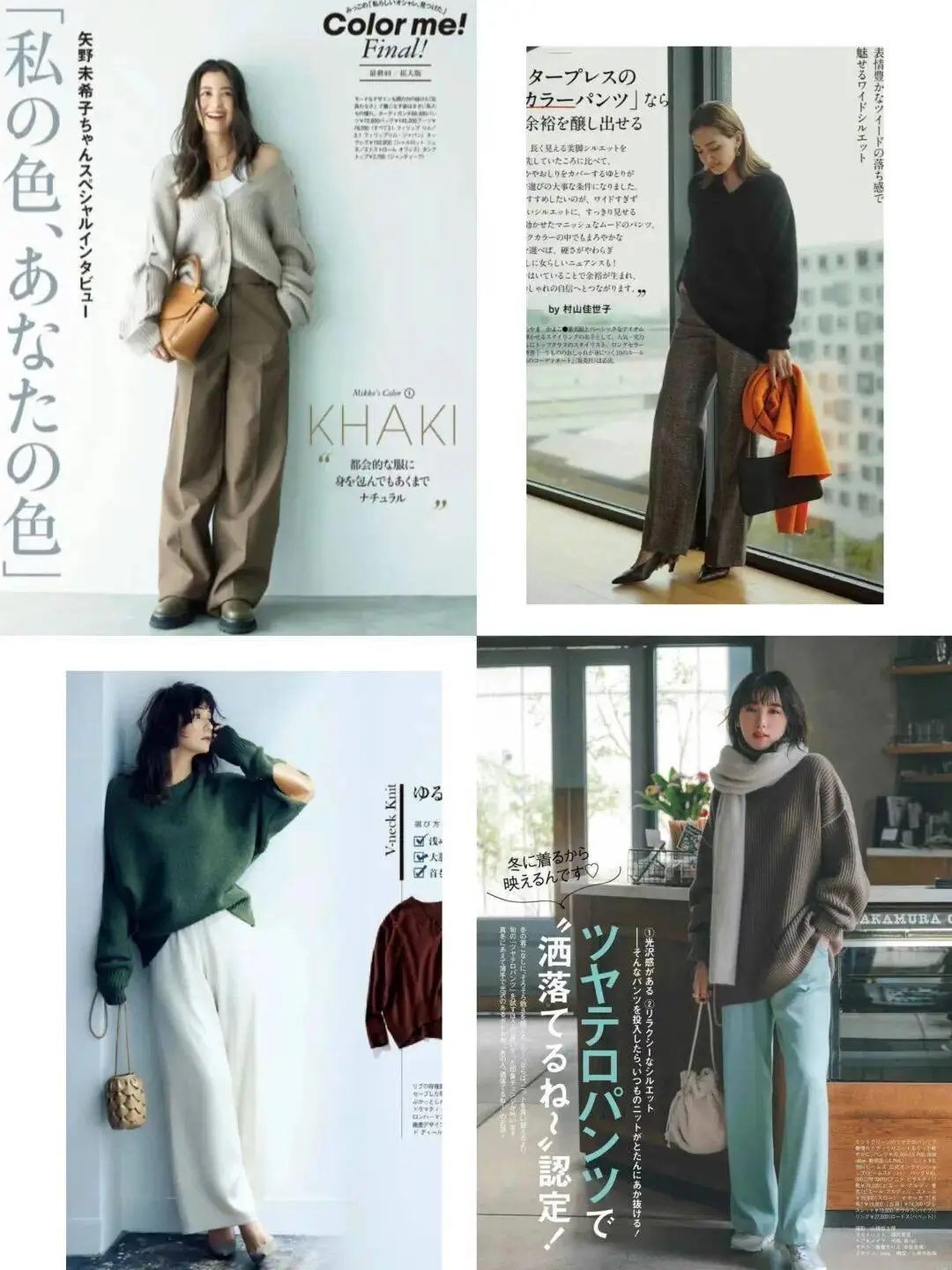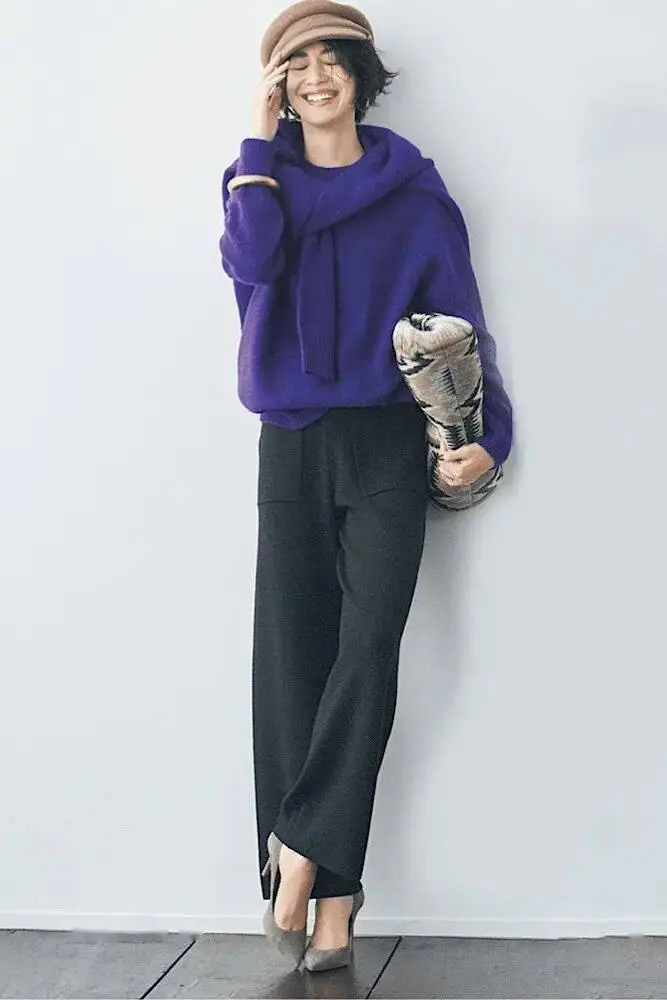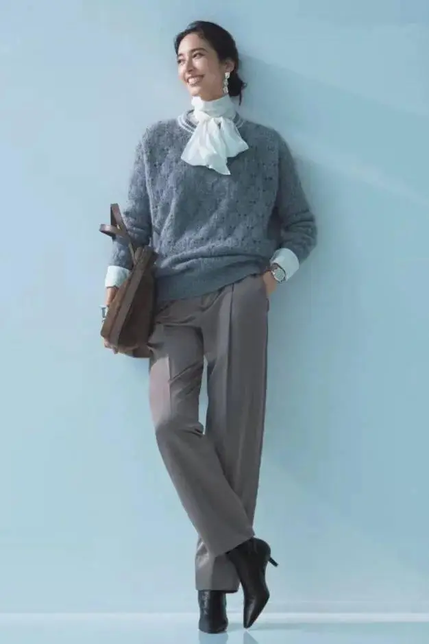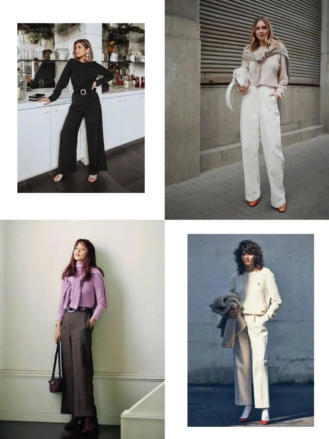 纯色阔腿裤是日常搭配率很高的经典基础款,简单搭配大毛衣就能打造出不过时的优雅感,彰显不俗品位与好气质。用oversized大毛衣搭配时,“半塞”法(塞一半或一侧)能保留慵懒感又显高显瘦。黑、白、灰三色阔腿裤作为百搭基础款,可轻松搭配所有毛衣;同色系搭配则能纵向拉长身型,让造型更有质感。