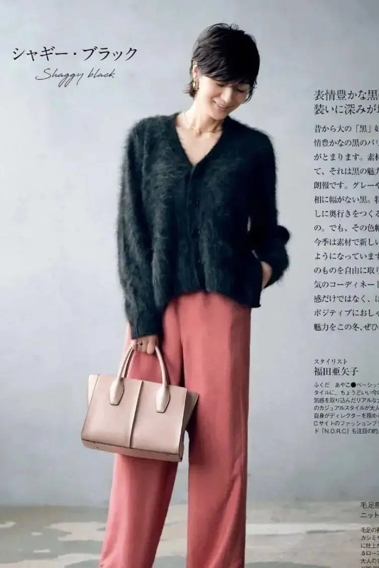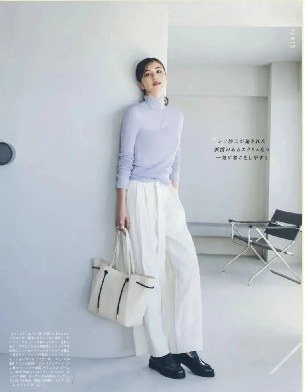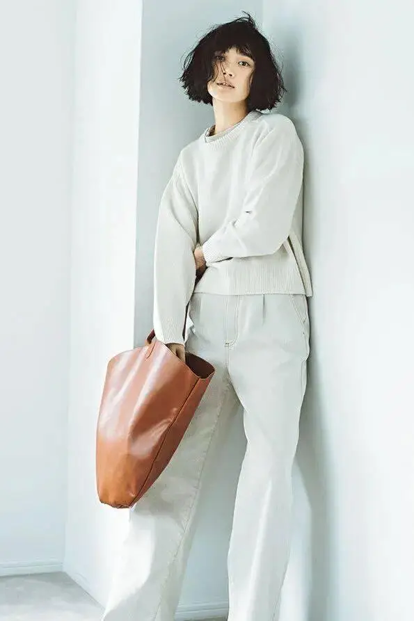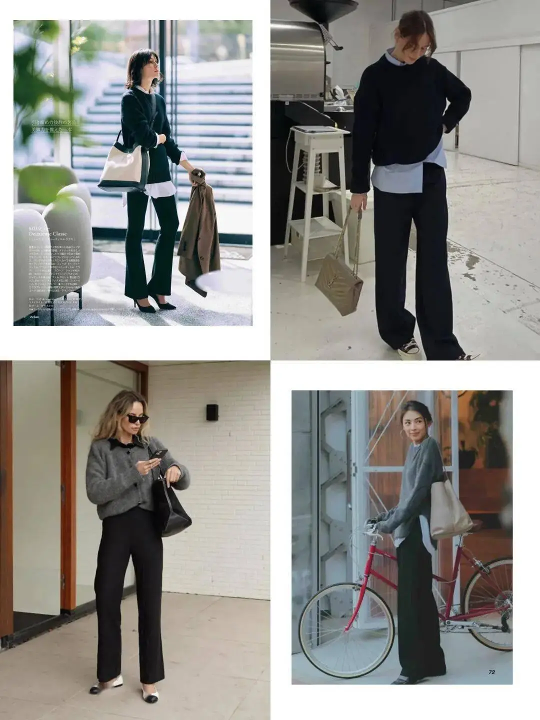 纯色阔腿裤是日常搭配率很高的经典基础款,简单搭配大毛衣就能打造出不过时的优雅感,彰显不俗品位与好气质。用oversized大毛衣搭配时,“半塞”法(塞一半或一侧)能保留慵懒感又显高显瘦。黑、白、灰三色阔腿裤作为百搭基础款,可轻松搭配所有毛衣;同色系搭配则能纵向拉长身型,让造型更有质感。