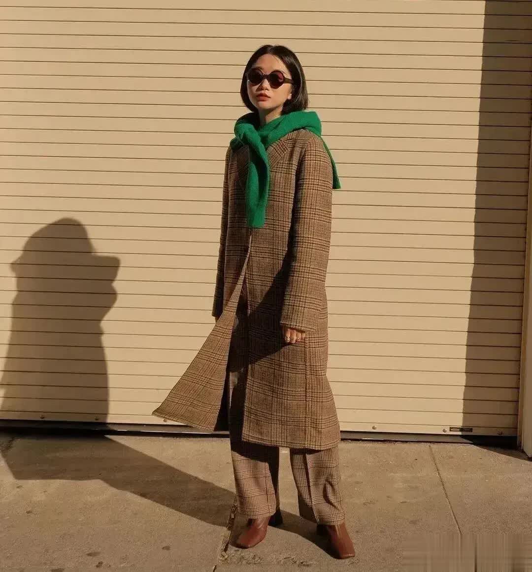 格纹的棕色毛呢大衣复古又气质,搭配同色系的格纹高腰裤、粗跟短靴,一整套秋冬的气质氛围感,腔调十足。搭配墨绿色的围巾,提亮穿搭,增添时尚感。▼