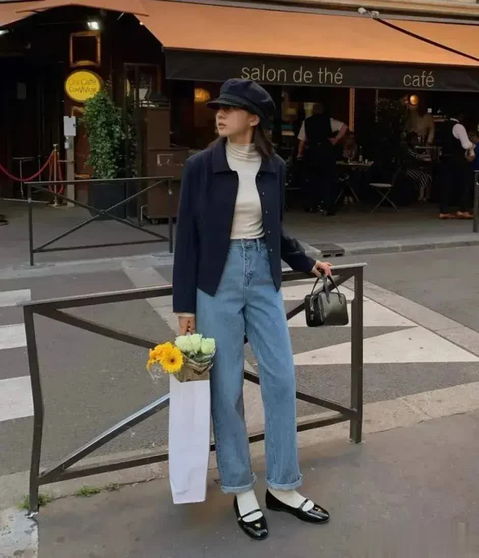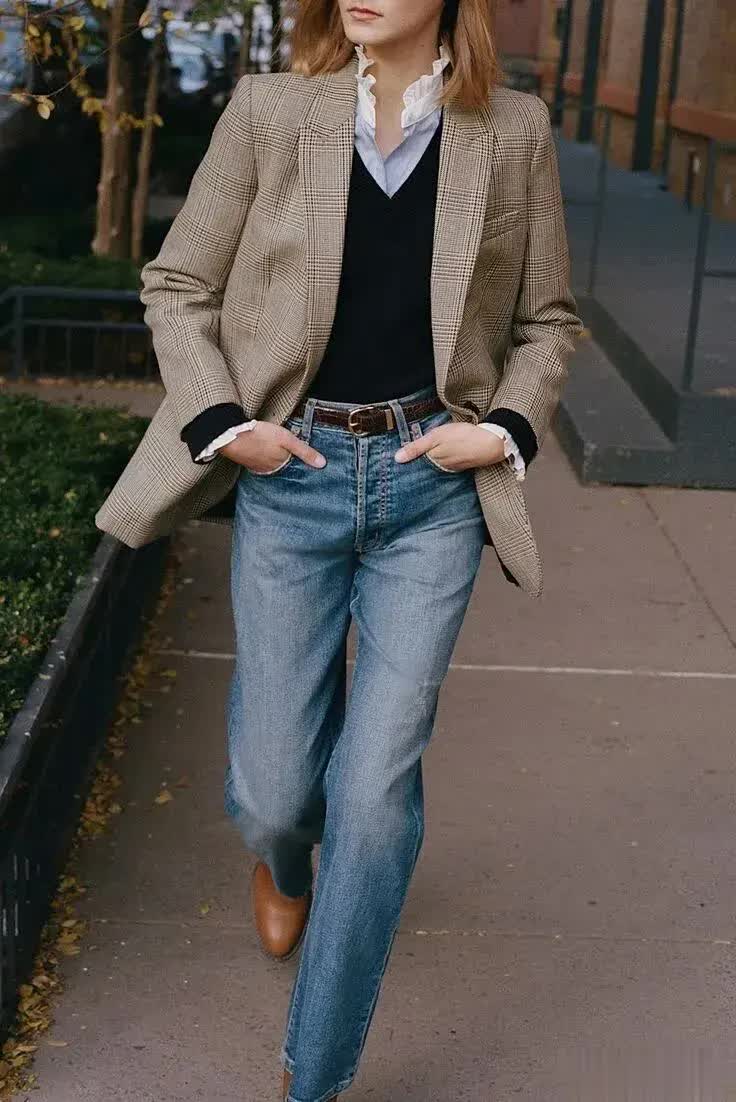 格纹西装外套搭配高腰牛仔裤,内搭打造出高腰线很显高,适合矮个子姐妹。牛仔裤的不羁休闲感中和了西装的正式和利落,让整套穿搭更时尚耐看,大方又有气场。▼