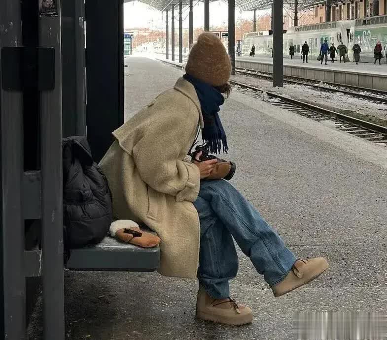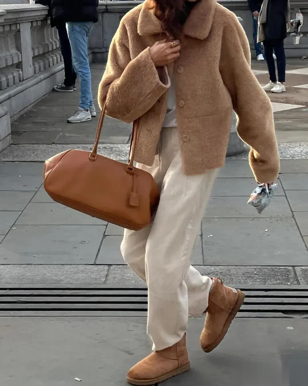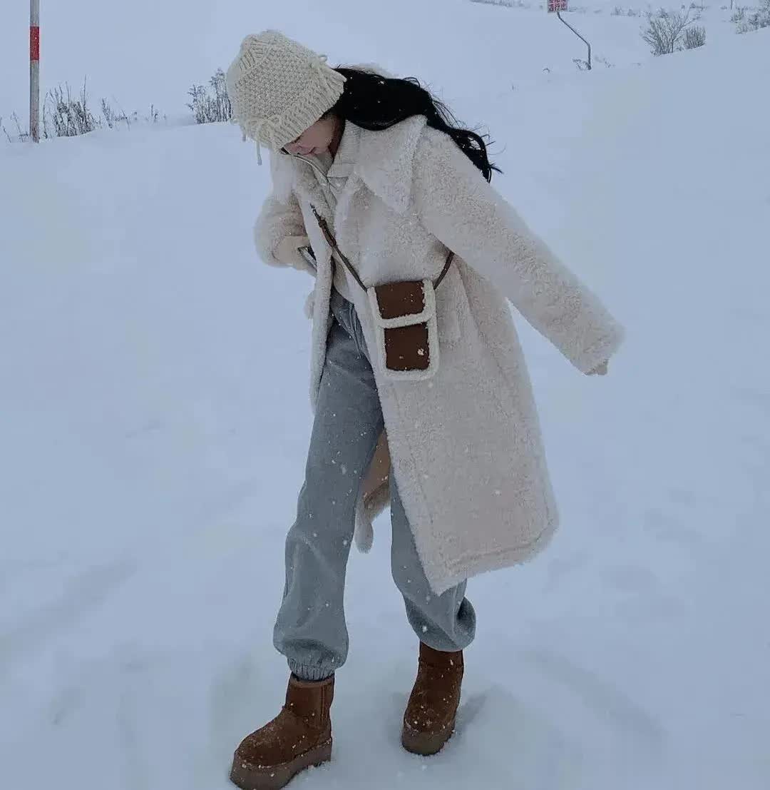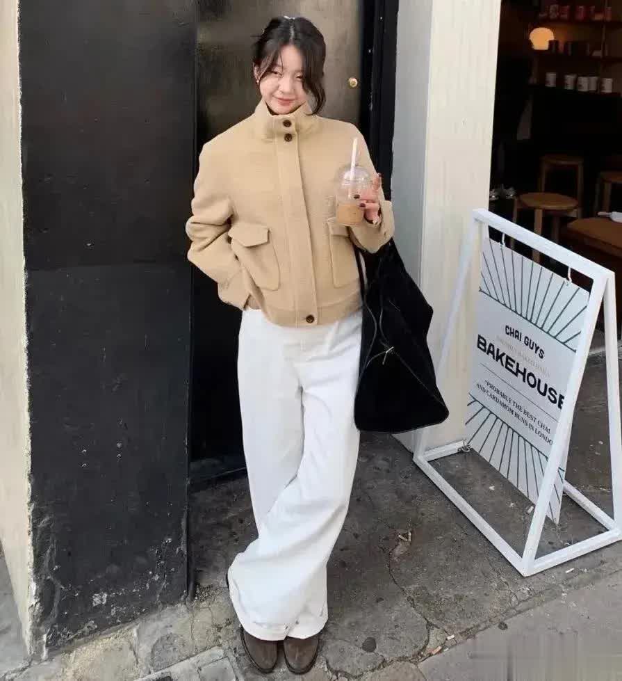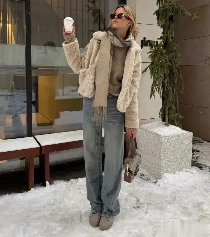 浅大地色系的羊羔毛外套,搭配阔腿裤,再搭配一双雪地靴,冬天的文艺氛围就出来了。一整套既保暖舒适,又气质出片,太适合35岁以上的矮个子姐妹了。▼