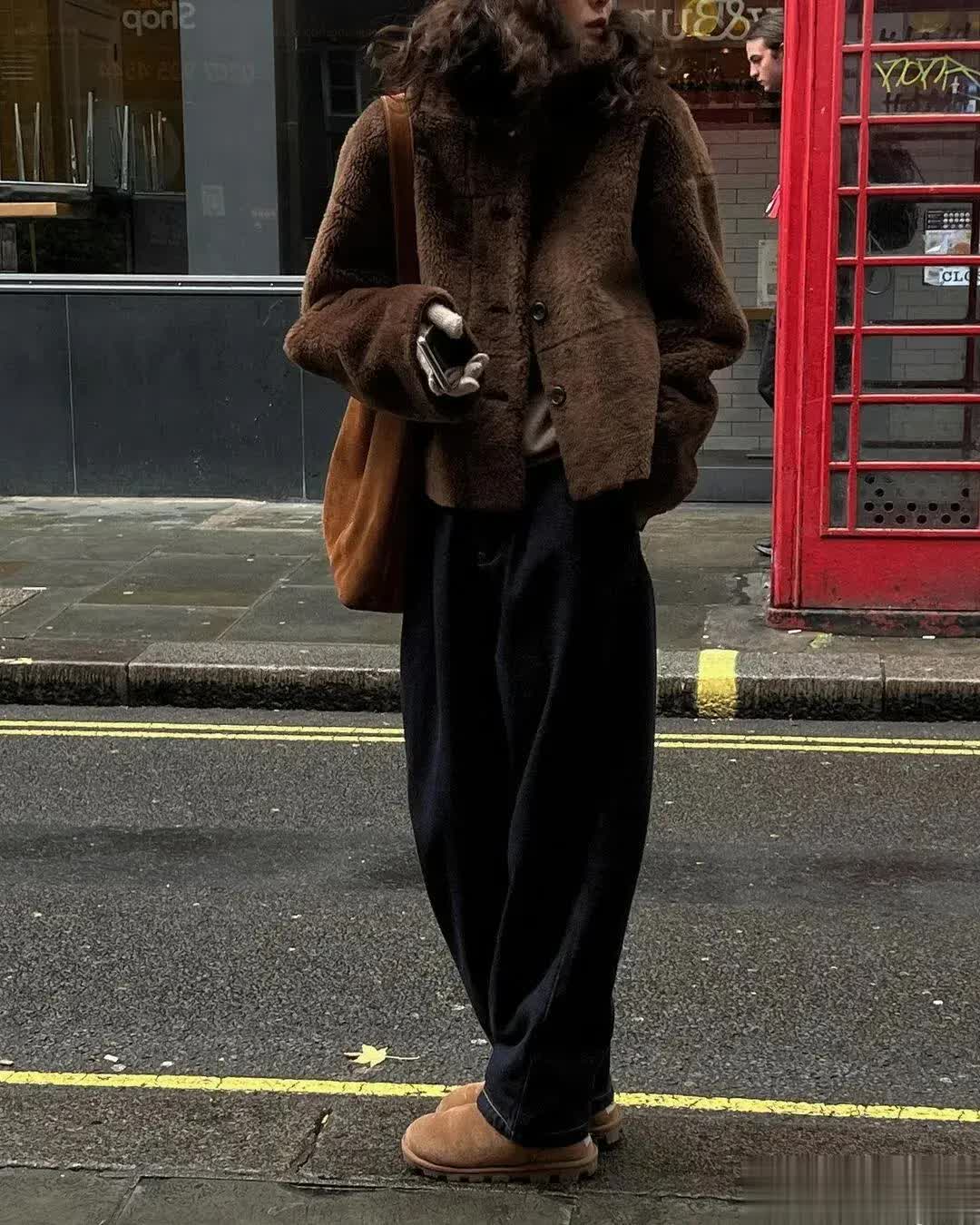 棕色的羊羔毛外套充满秋冬氛围感,搭配深色的高腰阔腿裤,显高显瘦,复古又有松弛感。▼