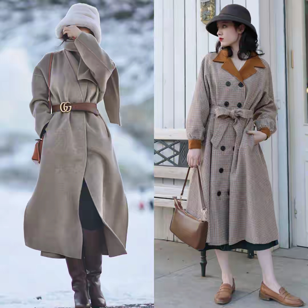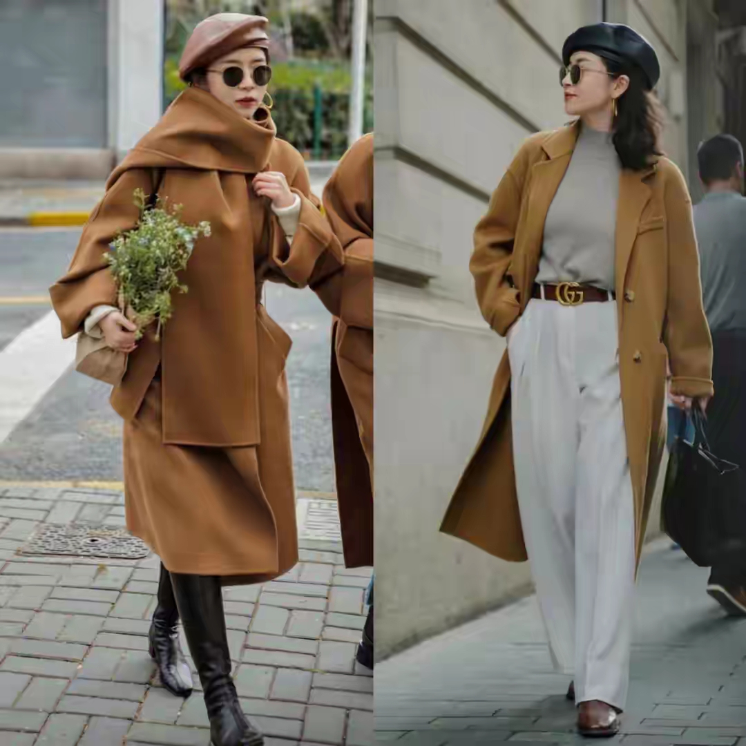 不管是高个子还是小个子,大衣都建议选高腰收腰款。衣摆可以略宽,或者自带腰带——穿的时候系上,或者额外加一条棕色腰带,都能提升腰线,达到显高显瘦的效果。