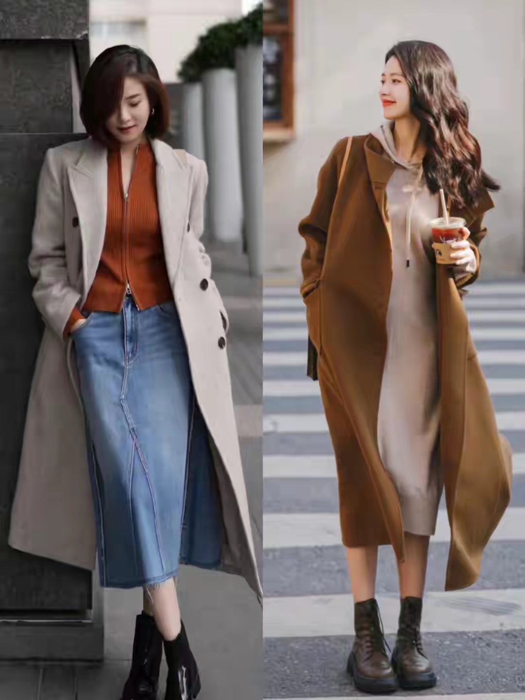 如果想让造型更有层次感,选半身裙是不错的选择。比如蓝色牛仔直筒半身裙搭棕色针织开衫,再外披米灰色大衣,脚踩黑色短靴,时尚感拉满;若喜欢更流畅的身材比例,驼色大衣配卫衣连衣裙加马丁靴,会显得更洋气。