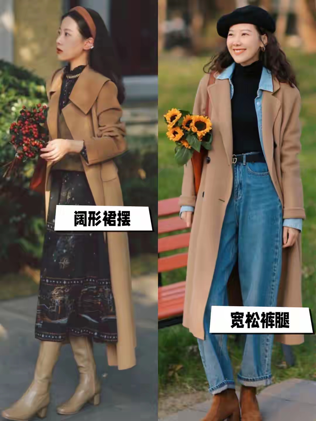 普通大众女性不太推荐大衣配小脚裤,紧身裤换成蓝色牛仔阔腿裤会更遮肉显瘦、大方得体;或者用半身裙搭驼色大衣,脚踩皮质中筒靴,高级又有气场。