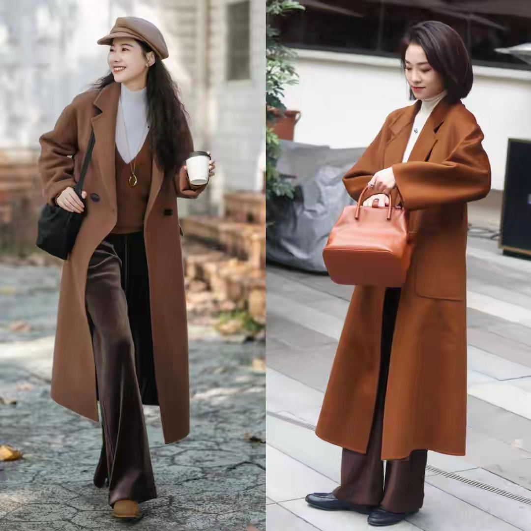 如果外出不方便穿裙子,阔腿裤就是大衣的绝佳搭档——能打造强大气场。比如黑色阔腿裤配灰色大衣加黑色短靴,御姐风十足;棕色阔腿裤搭驼色大衣加深咖色高跟短靴,干练又利落。