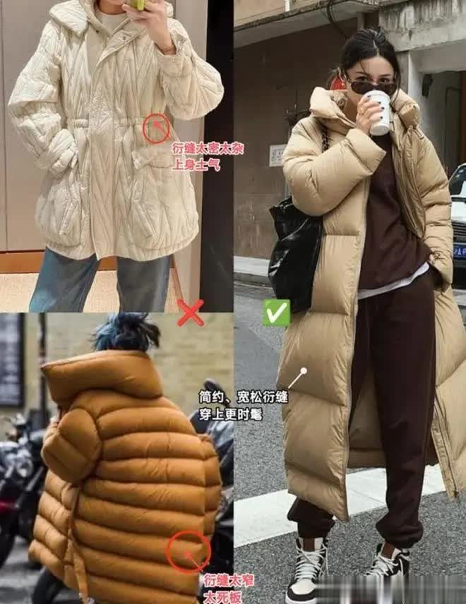 很多人穿羽绒服显臃肿,可能是因为款式设计太复杂。冬日选羽绒服要优先轻盈款,搭配时遵循“去繁就简”原则:纯色款更显高级,过多花纹或复杂绗缝会让造型显得杂乱,反而失去气质。