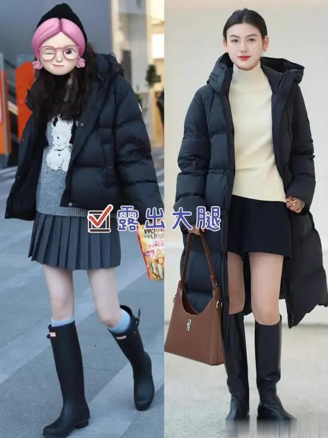 对于小个子或比例不佳的女生,羽绒服与鲨鱼裤的长度差是关键。超短款羽绒服配鲨鱼裤,能直接营造“上短下长”的视觉效果,轻松穿出三七分比例;若在短羽绒服外系一条腰带,更能拉高腰线,打造“胸以下全是腿”的既视感,显高又时髦。