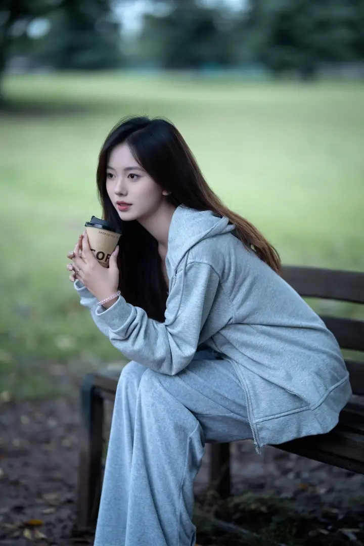 秋冬拍照,热咖啡是氛围感神器。侧坐在长椅上,双手捧着温热的咖啡杯,视线不看镜头,自然投向远方。这个姿势能完美展现侧脸轮廓,在柔和的光线下显得格外温柔,仿佛在安静等待某个人,故事感拉满。