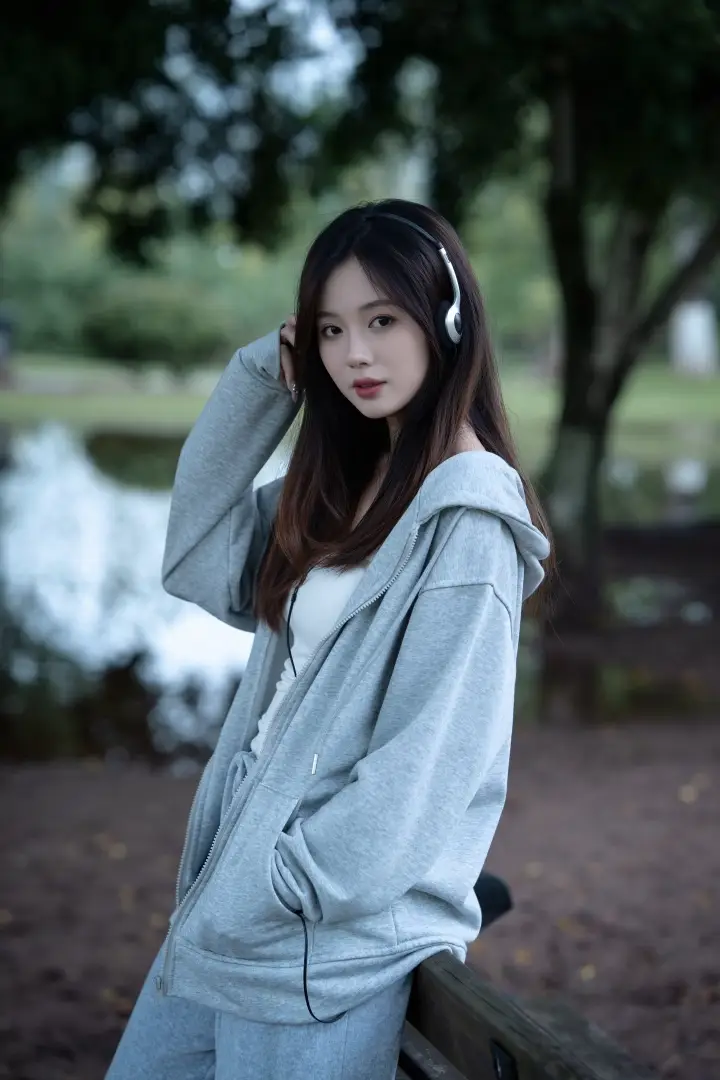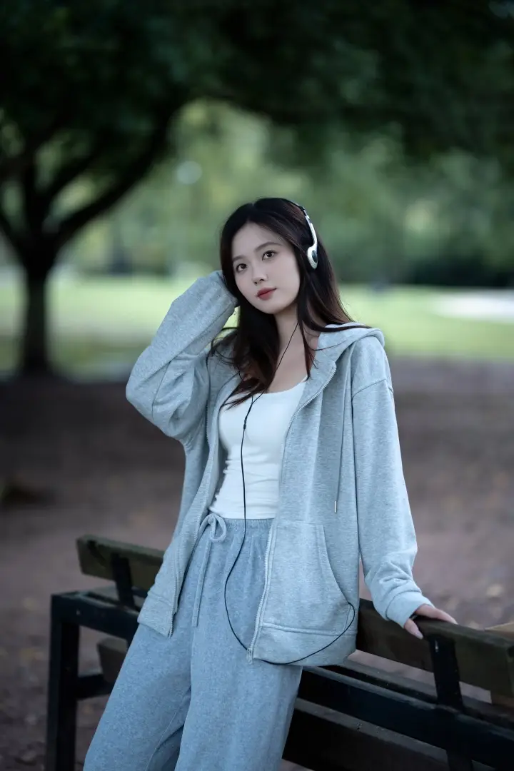 谁说长椅只能坐?试试更随性的姿势:身体靠在椅背上,一只手撑着椅背,另一只手轻扶耳机。这个姿势能让身体线条更舒展,告别拘谨感。眼神不看镜头,反而更显放松,满满的松弛感。